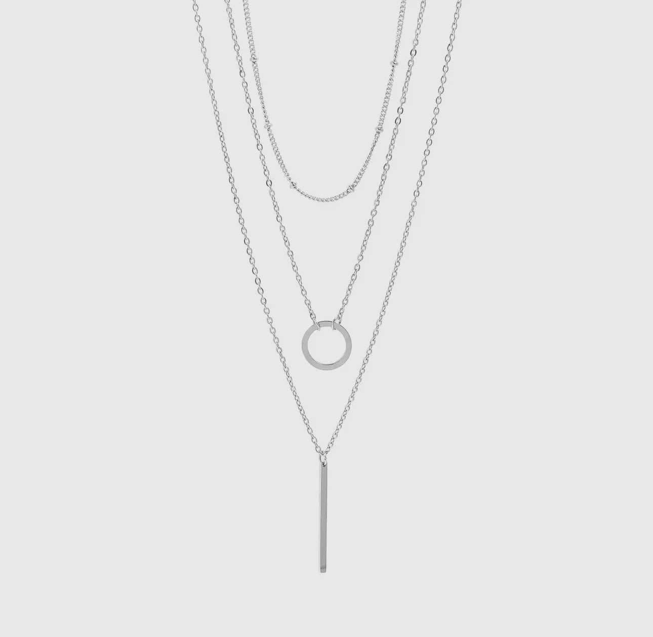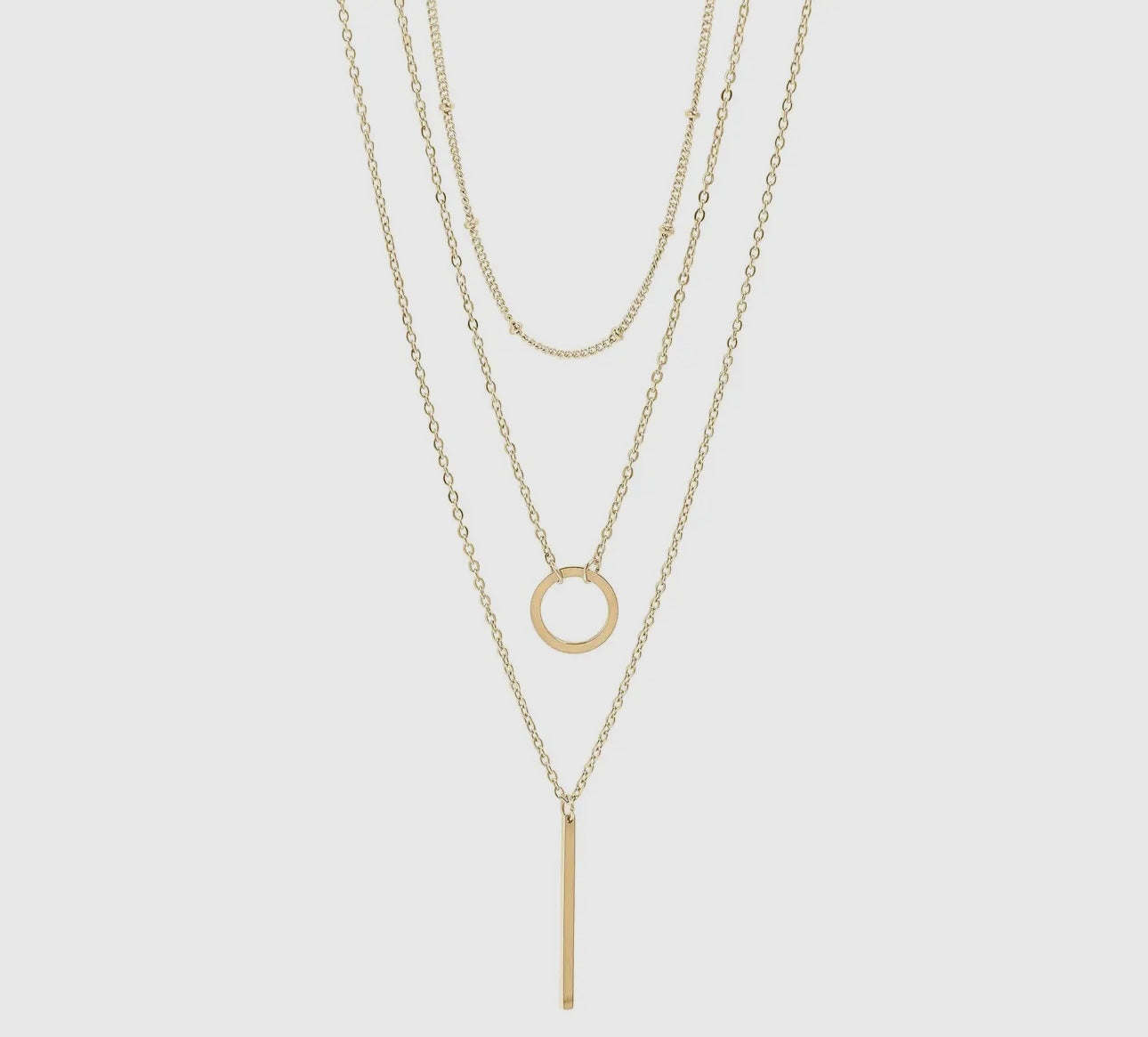 The Loop & Satellite 3-Row Layered Chain Necklace is a stunning everyday basic for every collection. Featuring 3 chains layered as a single necklace, this layered look is perfect for every season and adds a certain texture and interest to any outfit. Between this necklace's popular look and classic style, it is sure to be a top seller in any storefront or jewelry collection!