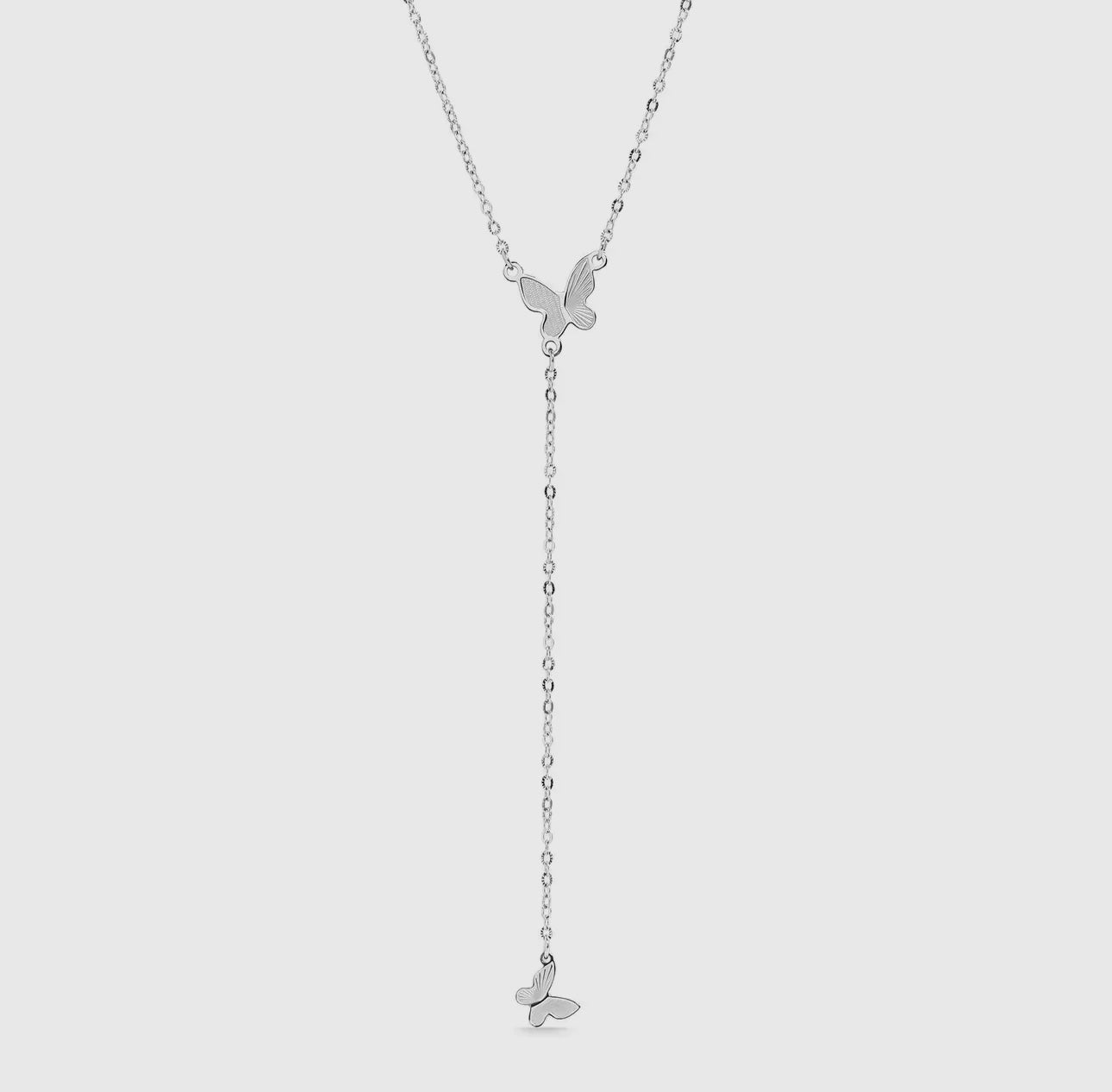 Add a touch of elegance to any outfit with this Lariat Necklace with a butterfly. Whether you wear this necklace by itself or layer it with other pieces for a more dynamic look, this necklace brings versatility and modern edge to any ensemble. The butterfly symbolize transformation and beauty, making it a meaningful gift option for your customers. A perfect balance of luxury and durability, this PVD stainless steel lariat necklace is made for those who value quality and style.